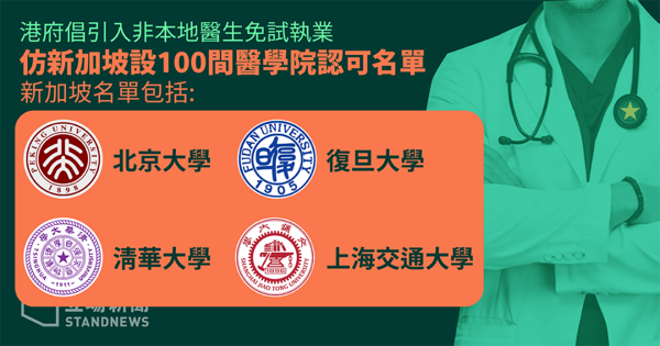 港府倡议成立委员会,订立一份约有100间非本地医学院的名单,符合条件的医生可免除执业试要求。同时,认可医学院的质素要与港大及中大医学院相约。