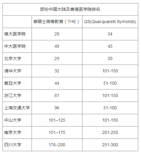 以及QS(Quacquarelli Symonds)去年世界大学医学院排名,100名以内共有5间中国大学的医学院。